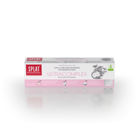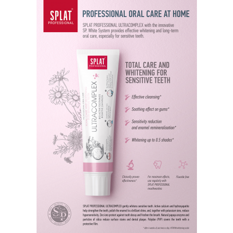 SPLAT® PROFESSIONAL ULTRACOMPLEX® gently whitens sensitive teeth, maintains gum health and provides exceptionally fresh breath. Innovative Sp.White System polishes the enamel to a brilliant shine and promotes oral care health - natural papaya enzyme (Papain) and rounded polishing particles of silica help to remove surface stains and dental plaque, Polydon (PVP)- film-forming component, covers teeth with a protective film, effectively contributing to long-term cleansing. Hydroxyapatite helps to reduce hypersensitivity, active Calcium strengthens the enamel. Potassium ions (Potassium Nitrate) also relieve tooth sensitivity while Zinc ions (Zinc Citrate) protect against tooth decay and freshens breath.