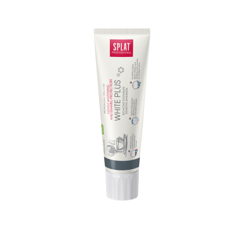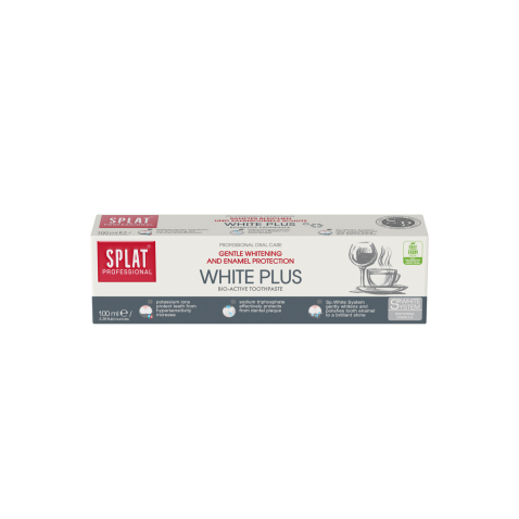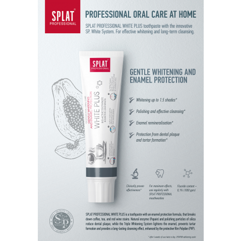 SPLAT PROFESSIONAL WHITE PLUS is a toothpaste with our whitening Sp. White System®, which polishes the enamel to a brilliant shine - natural papaya enzyme (Papain) and rounded polishing particles of silica help to remove surface stains and dental plaque, Polydon (PVP) – film-forming component, covers teeth with a protective film, effectively contributing to long-term cleansing. Tripple Whitening System (System of Triple Action Phosphate) breaks up coffee, tea and red wine stains, which effect teeth colour, gently polishes tooth enamel: